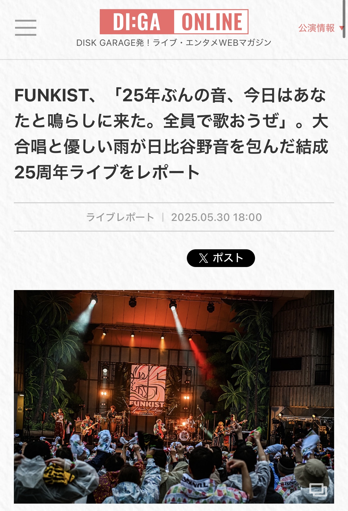 News 2025/05/30 ( Fri ) UP DI:GA ONLINEに日比谷野音ワンマンのライブレポが掲載!